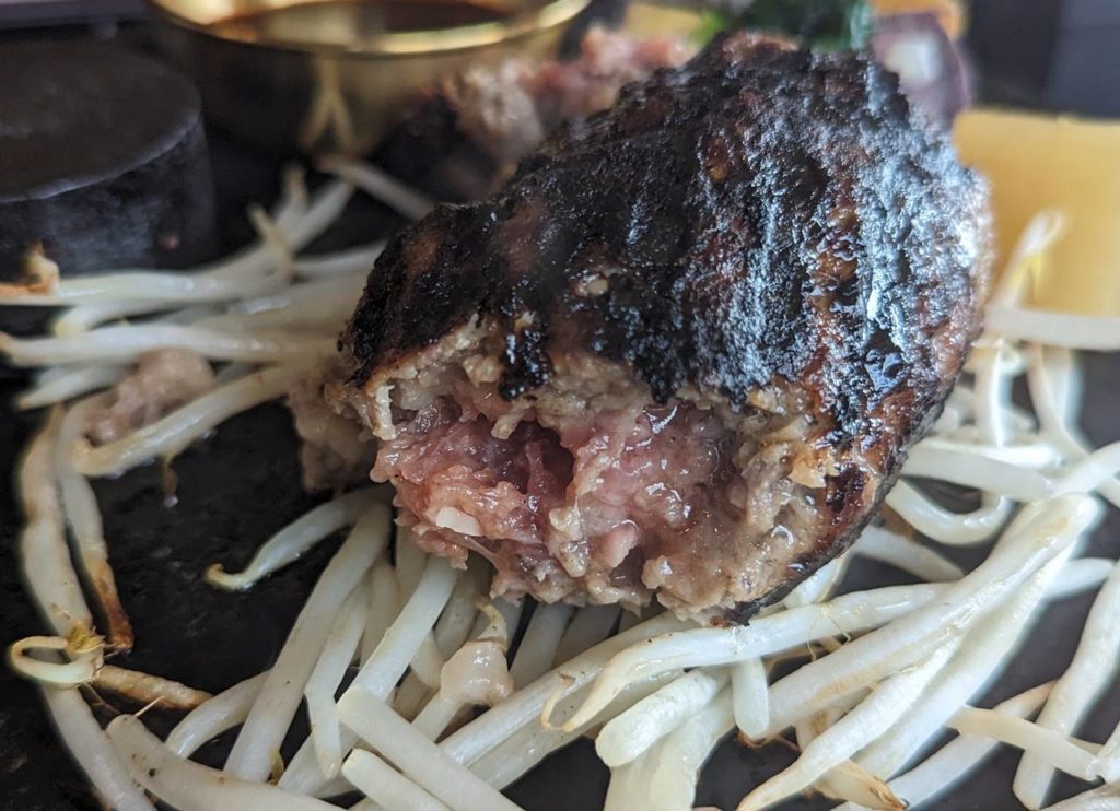 この肉はかなり粗挽きで肉の食感がほぼそのまま残っている。だったらこの焼き加減がとてもいいという感じ。