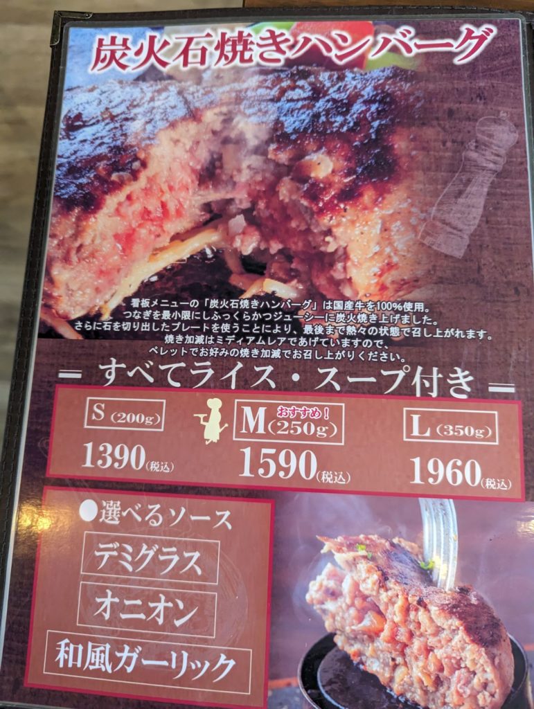 「炭火石焼きハンバーグ」S 1,200g:390円/M 250g:1,590円/L 350g:1960円